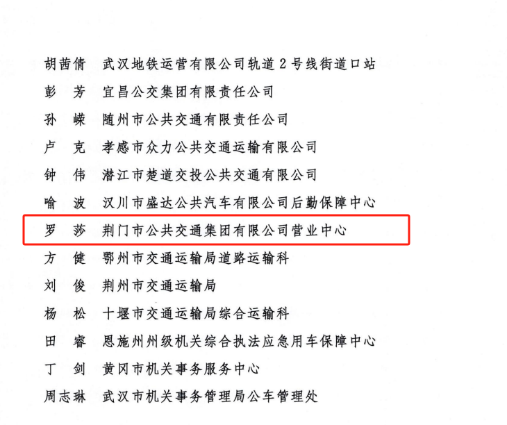 近日,交通運輸部、公安部、國家機關(guān)事務(wù)管理局、中華全國總工會、共青團中央聯(lián)合發(fā)出《關(guān)于表揚2023年綠色出行宣傳月和公交出行宣傳周活動成績突出集體和個人的通報》。其中,荊門市公共交通集團有限公司營業(yè)中心被評為活動成績突出集體,荊門市公共交通集團有限公司羅莎被評為活動成績突出個人。