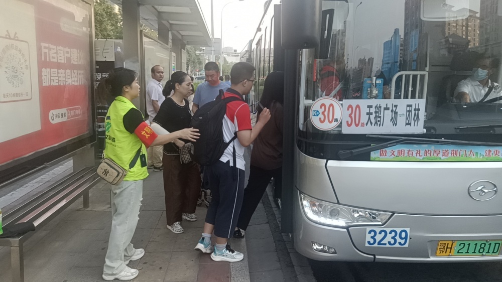 開學(xué)當(dāng)天,人流大、車輛多,在城區(qū)各個(gè)學(xué)校附近,公交志愿者身穿綠馬甲或是佩戴安全袖章,守候在關(guān)鍵路口、站臺和斑馬線,面帶笑容引導(dǎo)學(xué)生安全出行。