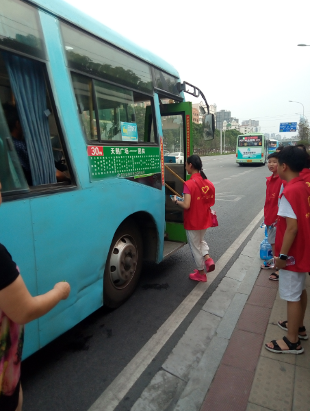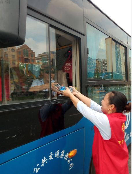 15時許,志愿者們已經(jīng)布置好了送水點(diǎn),將箱礦泉水?dāng)[在了站臺旁邊。每有一輛公交車進(jìn)站???,志愿者們都會給駕駛員們遞上兩瓶礦泉水,還有一些放暑假的小朋友們,也熱情的加入到此次活動,充當(dāng)著志愿主力軍,用他們的行動清涼了公交駕駛員的心,傳播著社會正能量。