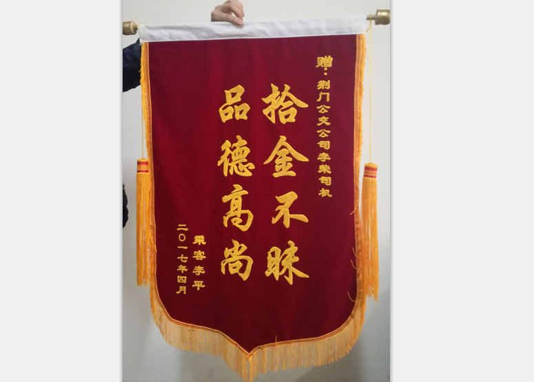 2017年4月4日上午九點左右,一名乘客由于粗心大意,不慎將一個包包遺留在公交車內(nèi),包包內(nèi)裝有蘋果平板電腦一個、手機一部、金銀手飾一包、銀行卡數(shù)張、身份證、現(xiàn)金若干.......二公司三路車159#駕駛員李榮在到達運動公園始發(fā)站打掃衛(wèi)生時發(fā)現(xiàn)了一個紅色包包,該駕駛員立馬與隊長取得聯(lián)系、剛好隊長和站務(wù)在始發(fā)站,駕駛員李榮親自將包交給了隊長,并說明原由,并在眾人下隊長打開了包包,發(fā)現(xiàn)里面的都是貴重物品。不久,失主打包內(nèi)的電話來詢問此事,隊長認真做了回復(fù),告之為保證物品安全,要攜帶證明按程序認領(lǐng)。當天下午失主李女土從公司支部書記手中認領(lǐng)失物。昨日送來錦旗一面。