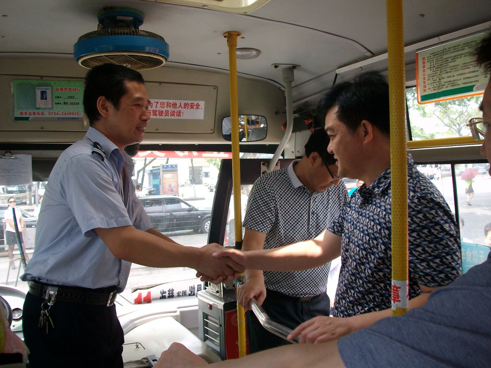 伍應彪(右)與公交駕駛員親切握手