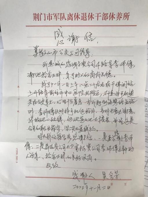11月6日上午9時(shí),公汽三公司收到由調(diào)度中心代收的一封感謝信,信中寫到“我真誠(chéng)的感謝貴公司4路車?yán)顜煾担x他拾金不昧。樂(lè)于助人的高尚品德”。