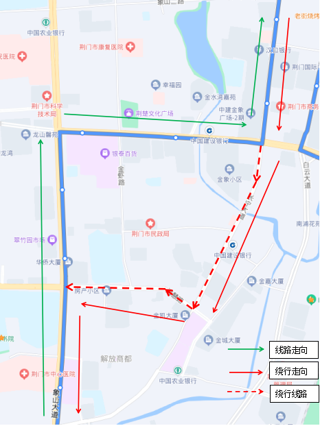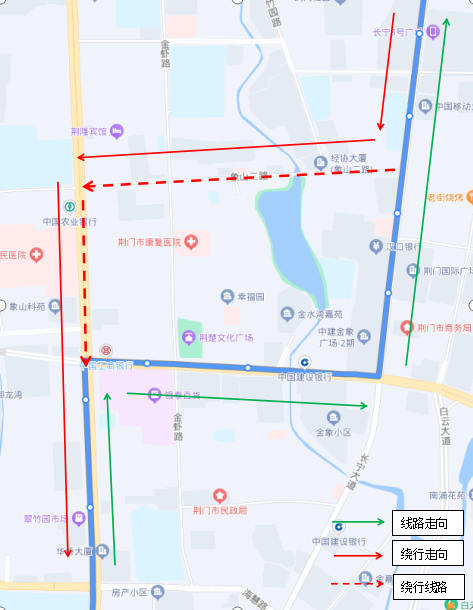 調(diào)整后新增??空军c(diǎn):瀏河橋(西側(cè))、金寧小區(qū)(西側(cè))、荊門(mén)電視臺(tái)(西側(cè))、鳳臺(tái)社區(qū)(北側(cè))、海慧中學(xué)(北側(cè))。